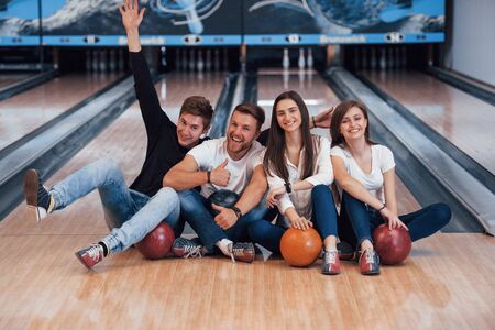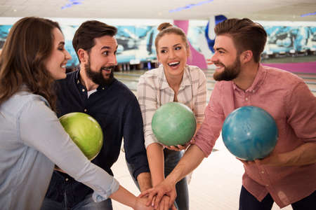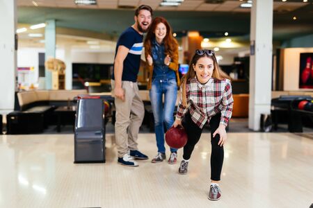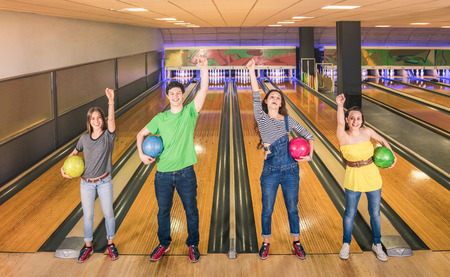 Good luck. Young cheerful friends have fun in bowling club at their weekends.