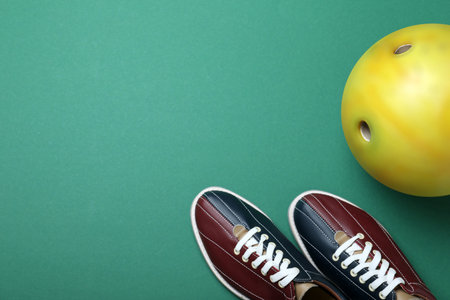 Bowling ball and shoes on green background, flat lay. Space for text