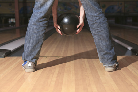 Holding ball against bowling alley.