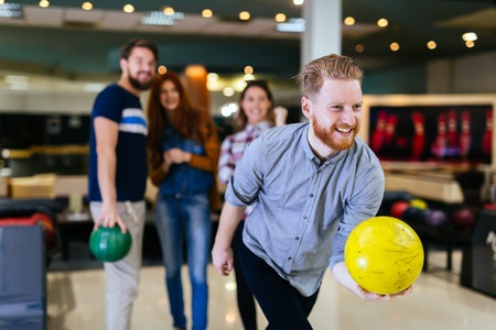 Group of friends playing bowling and having fun