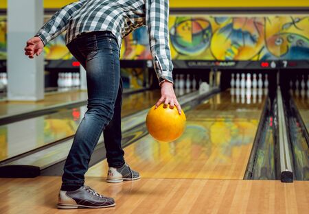 Young man playing bowling in club