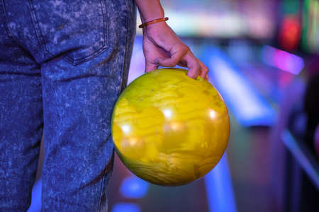 Bowling game. Woman having fun playing bowling in club. Girl holding ball ready to throw it on lane. Close up of hands. Lifestyle