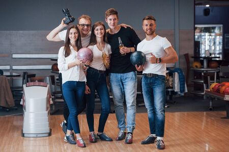 With photographer. Young cheerful friends have fun in bowling club at their weekends.