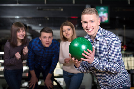 Ready to throw. Young cheerful friends have fun in bowling club at their weekends.