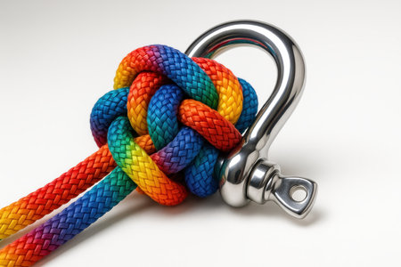 Vibrant rainbow colored rope intricately tied into a complex knot, secured by a gleaming chrome shackle. Symbolizing strength, connection, unity, and diversity.