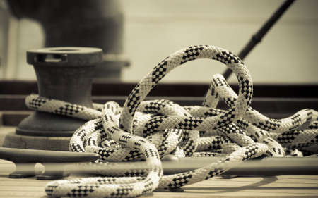 Winch with rope on sailing boat. Yachting yacht detail. Summer vacation and tourism. Sepia tone.