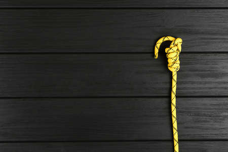 yellow rope on a black wooden background, rope on the floor top view