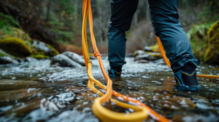 Close-up of outdoor adventure with hands tying climbing rope during hike.
