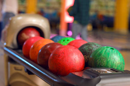 Bowling background. Interior of bowling alley lane with balls return machine closeup, selective focus on red ball