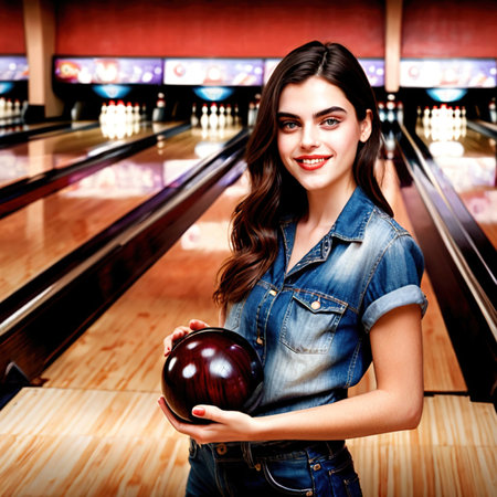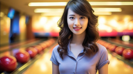 Choosing a ball Cheerful young women choosing bowling ball and smiling while standing against bowling alleys : Generative AI