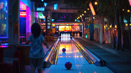 Immersive Retro Bowling Alley Scene with Vibrant Neon Lights Striking Lanes and a Lively Atmosphere of Entertainment and Leisure