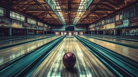 A single bowling ball sits on a polished lane, ready for the next strike. The alley is dimly lit, adding to the atmosphere.