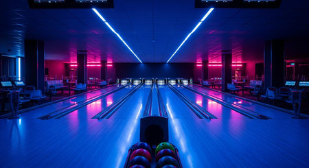 Immersive Retro Bowling Alley Scene with Vibrant Neon Lights Striking Lanes and a Lively Atmosphere of Entertainment and Leisure