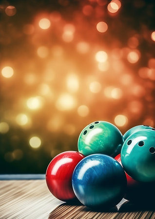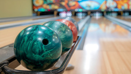 Three vibrant bowling balls sit on a polished lane, reflecting light. The colorful spheres invite players to a fun game in a lively bowling alley atmosphere.