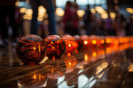 Striking view of a shiny red bowling ball reflecting lights and pins in the distance