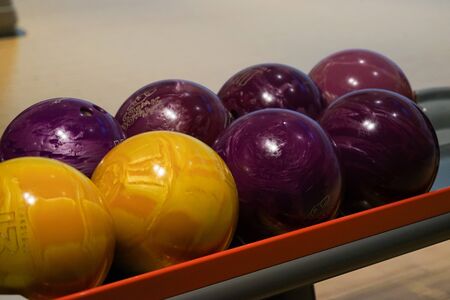 Close up of bowling balls. Bowling balls and wooden lane in bowling center. The concept of leisure