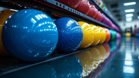 Colorful bowling balls arranged on a rack in a bowling alley during a lively evening session. Generative AI