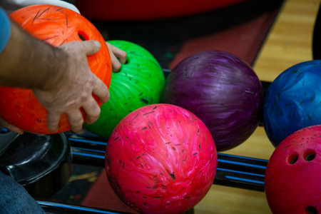 Bowling balls. Bowling alley. Vivid colors. Vertically framed shot