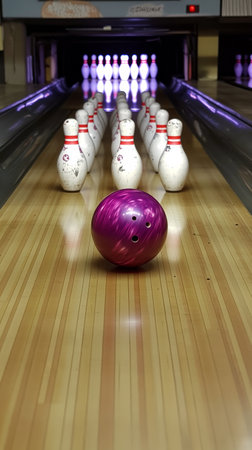 A vibrant purple bowling ball is rolling smoothly down the polished wooden lane toward a set of white bowling pins. The atmosphere is lively, typical of a weekend bowling activity.