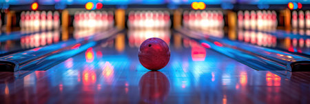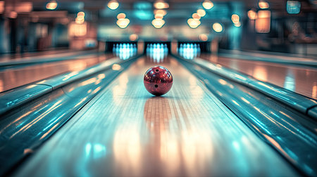 A striking red bowling ball captivates the scene as it rolls down a polished lane, igniting sparks, embodying the thrill of bowling. The ambiance of the alley enhances the excitement.