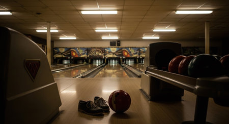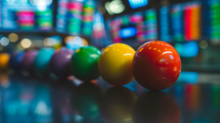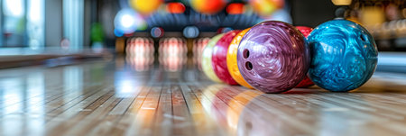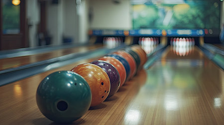 Bright neon bowling balls on glossy lane in modern bowling alley for a vibrant gaming experience