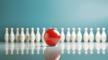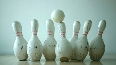 A striking image of white bowling pins with a single bowling ball perfectly balanced on top, symbolizing precision and skill in the sport of bowling.