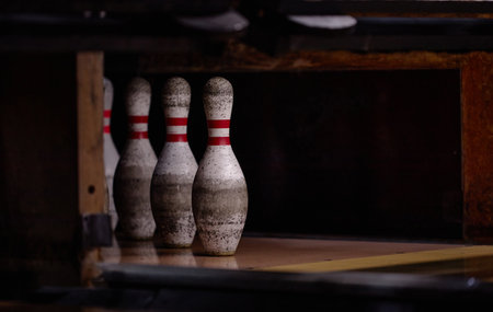 Close-up shot of four worn bowling pins standing in row within dimly lit bowling alley lane with reflections on floor creating atmospheric effect