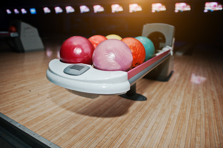 Bowling ball in bowling alley, closeup of photo with shallow depth of field