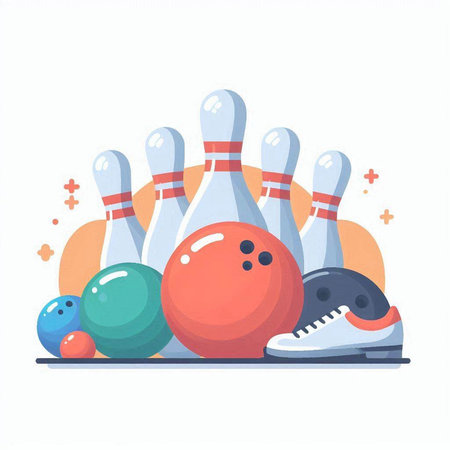 Bowling pins and ball on a bright yellow background, fun and vibrant colors create an energetic atmosphere perfect for playful activities and games