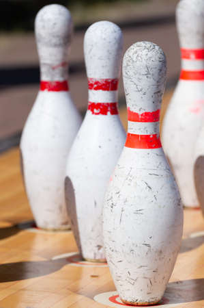 Ball game in bowling. Skittles, bokeh in the background. Theme for design