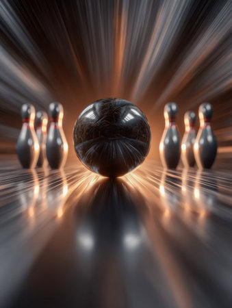 Bowling ball on a track with a perfect reflection, capturing the ball's glossy surface as it rolls toward the pins