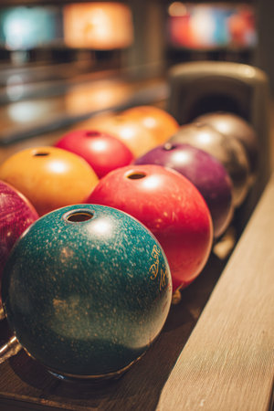 Colorful bowling balls displayed on a rack in a bowling alley, with blurred lights in the background enhancing the lively setting
