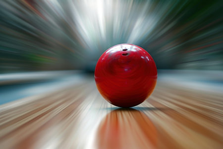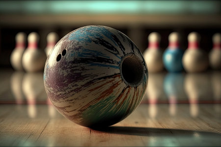 close-up of bowling ball with finger holes visible as it rolls down the lane, created with generative ai