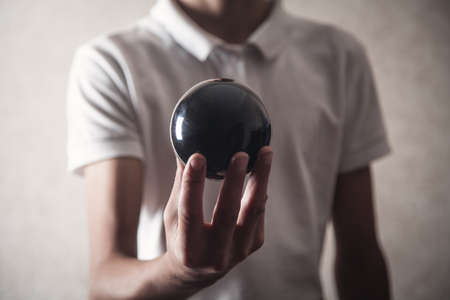 The human hand holds an orange bowling ball. Vivid colors. Summer day,