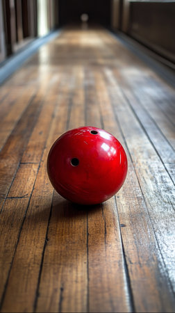 A bright red bowling ball rests in the center of a vintage wooden bowling lane, illuminated by soft overhead lighting. The spacious venue has an inviting atmosphere.