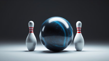 A captivating 3D rendering of a bowling ball rolling down a brightly lit lane, approaching the pins with dynamic energy.
