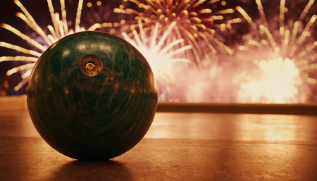 Green bowling ball on the background of fireworks. Selective focus. Toned.