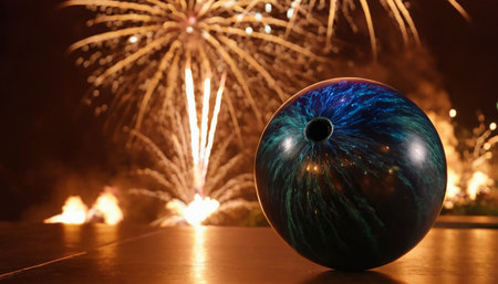 Colorful fireworks and bowling ball on dark background. Selective focus