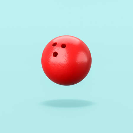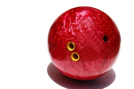 Glossy bowling ball with red and blue swirl pattern. Studio lighting and soft background. Sport equipment detail.