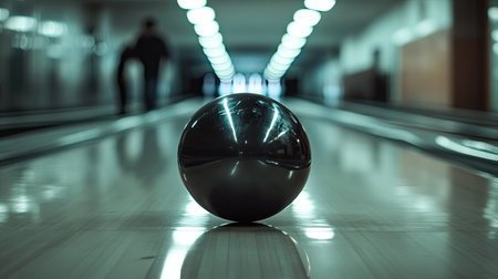 A single bowling ball sits on a polished lane, ready for the next strike. The alley is dimly lit, adding to the atmosphere.