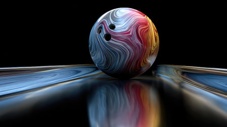 A vibrant and abstract representation of a bowling ball featuring colorful swirls and rich reflections, set against a dark backdrop for dramatic effect.