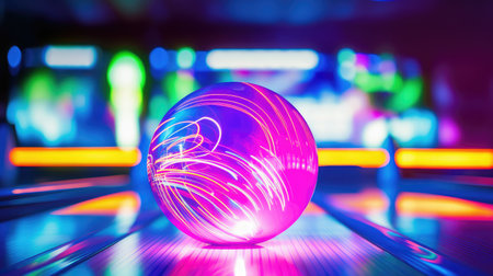 A sparkling bowling ball rests at the center of a lively bowling alley surrounded by colorful neon lights. The atmosphere is energetic inviting players to enjoy the game.