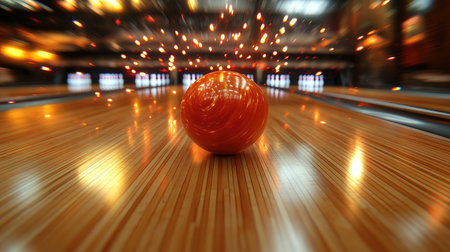 A striking red bowling ball captivates the scene as it rolls down a polished lane, igniting sparks, embodying the thrill of bowling. The ambiance of the alley enhances the excitement.