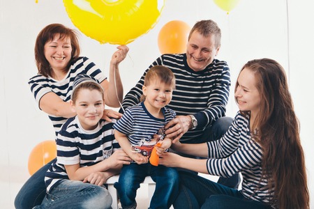 a group of five people on the background of balloons. Family photo at the party