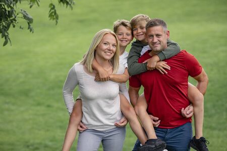 Happy family with two sons. Father, mother and two children enjoying time together.