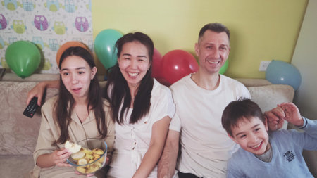 Family sitting on the couch at home and watching TV