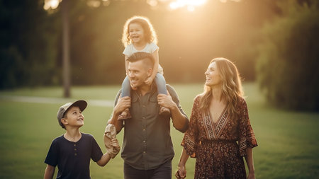A joyful family of four, including a mother, father, son, and daughter, are posing together outdoors in a sunlit park. The father is carrying the young daughter on his shoulders, and the family is smiling and laughing, enjoying a warm, golden sunset.