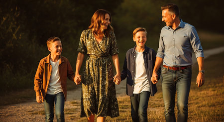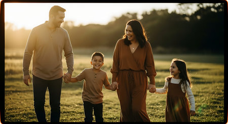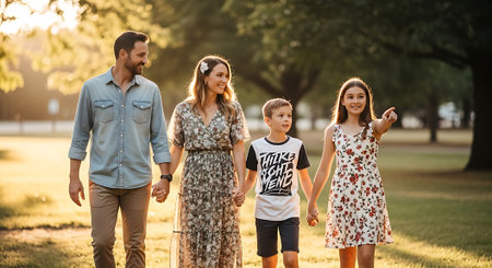 A joyful family of four holding hands and walking in a park during sunset. The scene is warmly lit with autumn colors.