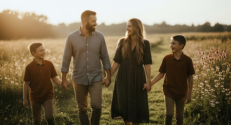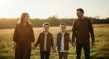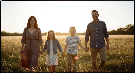 A happy family of four walking hand in hand through a serene field at sunset