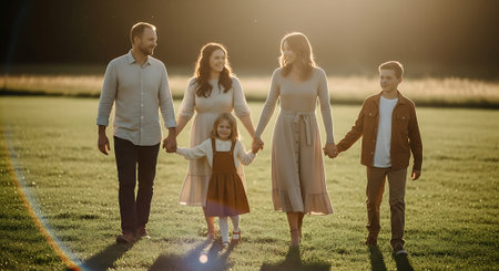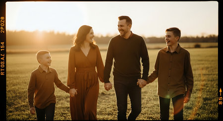 A happy family of four holding hands and walking together in a field at sunset